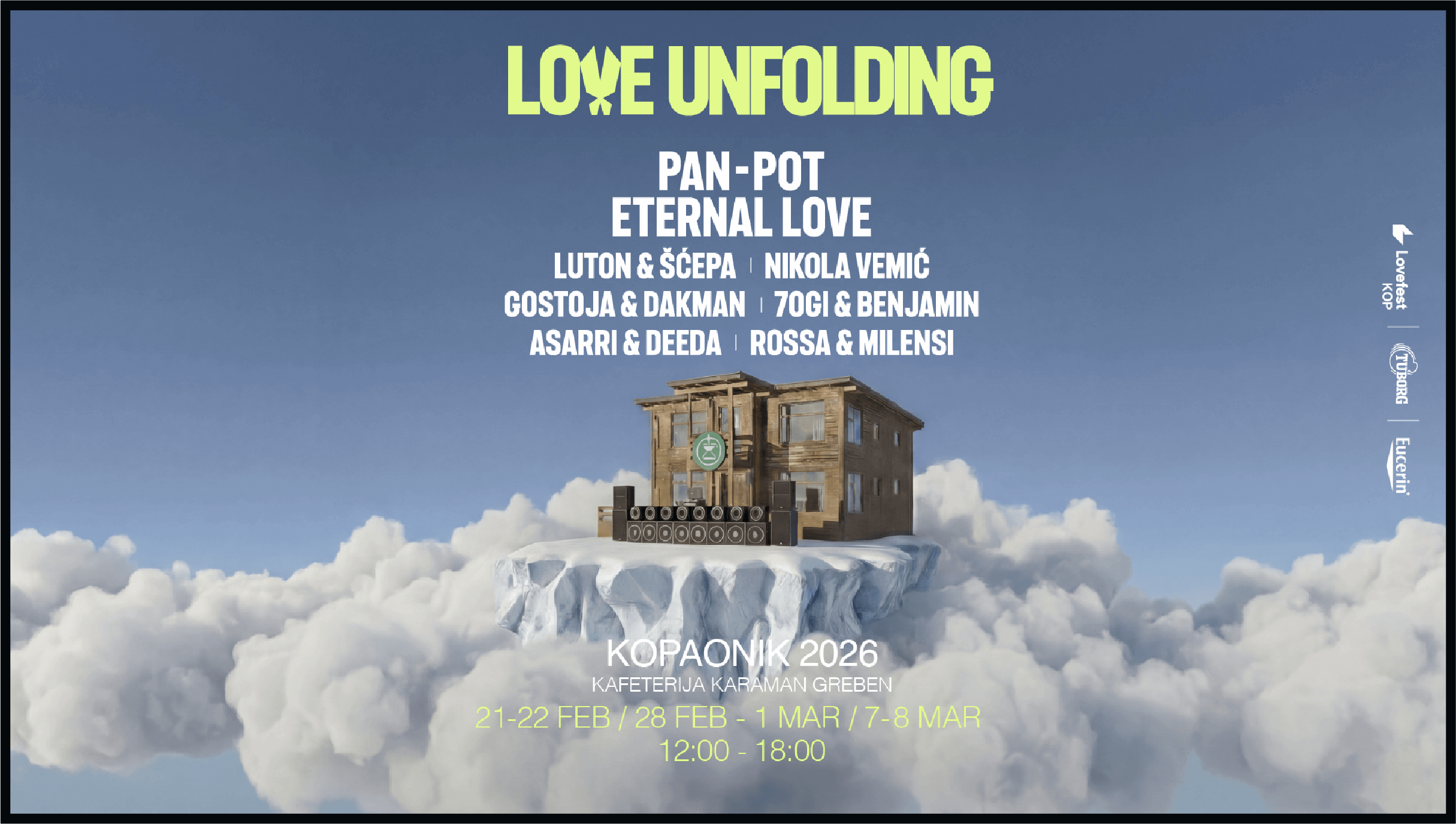 Tuborg Lovefest se vraća na Kopaonik sa zimskim serijalom 2026, pretvarajući staze u open-air plesni podijum. Od 21-22. februara, 28. februara-1. marta i 7-8. marta, skijaši i posetioci uživaće u vrhunskoj elektronskoj muzici uz nastupe Pan-Pot, Eternal Love i najboljih domaćih izvodača.